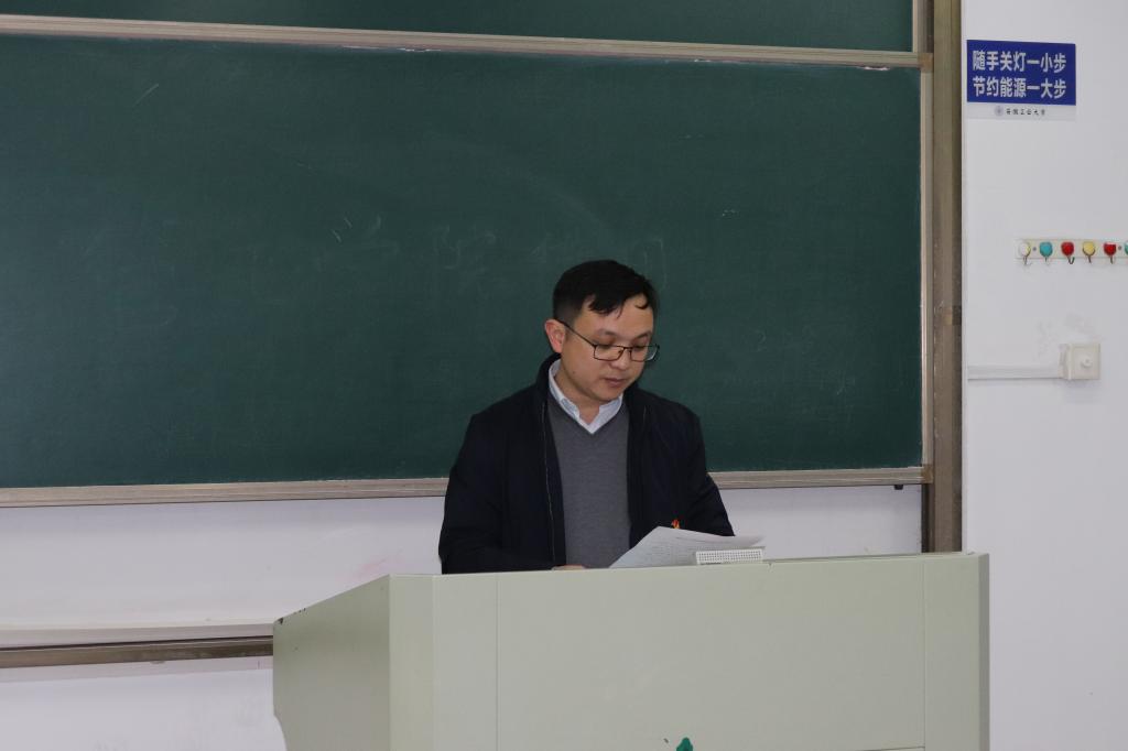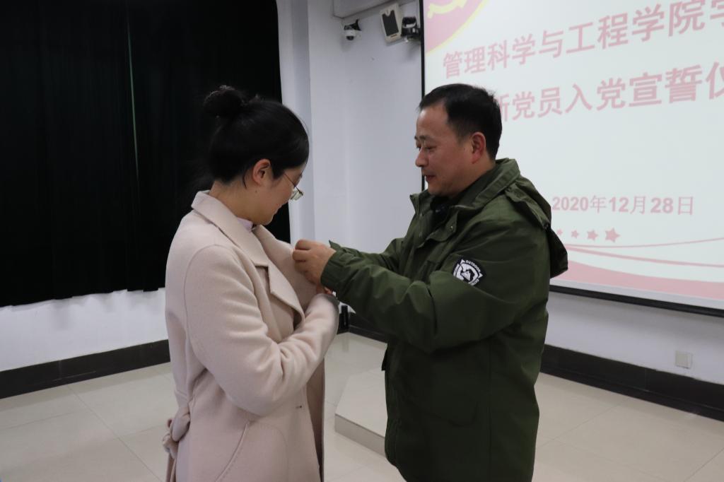 入党宣誓仪式在雄伟庄严的《国际歌》声中拉开帷幕。王功成宣读了新党员名单,老党员代表黄艳婷就如何做好一名优秀的学生党员进行发言,预备党员秦超群代表全体新党员表示,积极向身边的优秀党员学习,今后将注重个人修养,加强理论学习,坚定理论信念,牢记宗旨,敢于担当,奋发有为,做坚定的共产主义战士。汪春胜、王功成及支部书记为新党员代表佩戴党员徽章、并向他们赠送《中国共产党章程》。在鲜红的党旗下,预备党员集体进行了入党宣誓,全体与会党员共同重温了入党誓词。