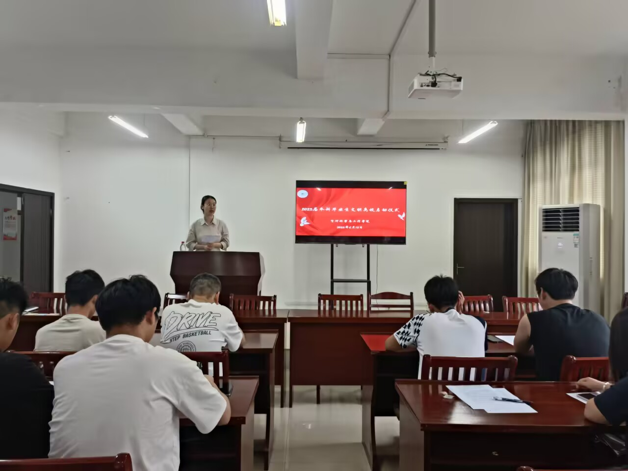 在汇文楼A308开展2025届毕业生文明离校专题活动。学院全体毕业班辅导员和2025届毕业生代表100余人参加此次活动。活动由2025届毕业班辅导员任静主持。