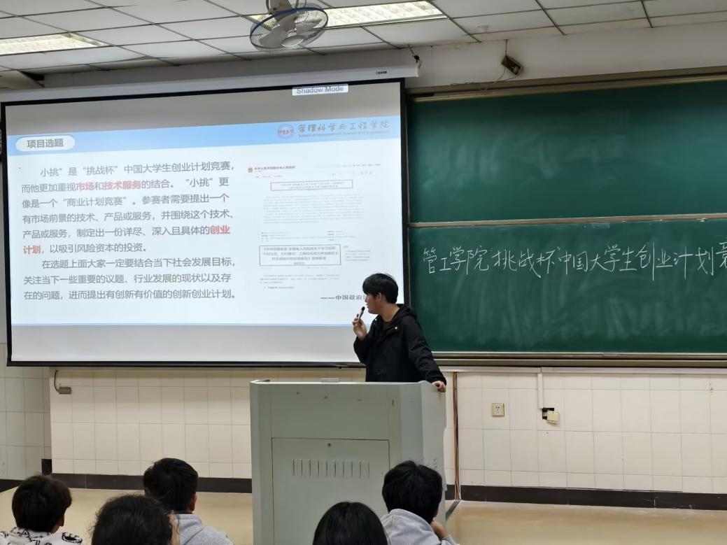 宣讲会上,赵玉婷结合“挑战杯”全国大学生课外学术科技作品竞赛指导经验,从大赛规则介绍与评分规则解读、各赛道选题分析等方面,系统为同学们进行了讲解。她指出,“挑战杯”不仅是一场知识竞技,更是团队协作与创新思维的实战平台,鼓励同学们积极组建团队、勇于尝试探索。会上,同时展示了学院部分优秀创业计划作品,以实际案例解析的形式帮助同学们更好地理解高质量创业计划的核心要素与规划路径。