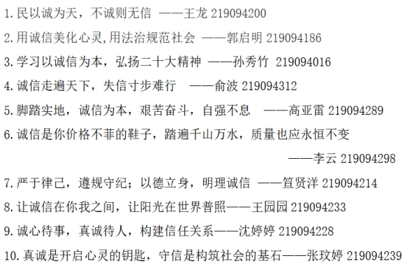 通过学院本次的诚信标语收集活动以丰富多样的形式强化了学院学生的诚信知识和诚信意识,也为学院学生品德修养、能力发展提供了实践锻炼、展示自我的平台。诚者,天之道也;思诚者,人之道也。相信H漫 的学子们将在以后的成长中秉持诚信准则,积极践行“诚信立身,秉信立行”精神,努力炼就合格新时代青年的诚信品质。