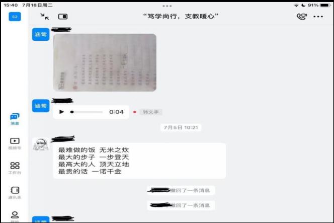 在暑期教学过程中,我逐渐发现了乡村孩子身上的不服输的韧劲和对知识的渴望,我知道暑期仅仅一两个星期的短暂教学无法满足孩子对于知识的无限追求,她时常在钉钉上给我发信息,“姐姐,这个怎么写?”“姐姐,这个是为什么?”我本就希望孩子能在我的课上学习到知识、有所收获,于是便以十二分的热情和动力面对她的每一个问题。