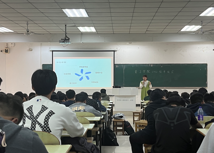 于教三南103举办 “资助两节课”主题年级会。学院资助工作负责老师赵玉婷主讲,辅导员焦朋庆及22级全体同学到场参加。