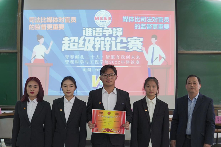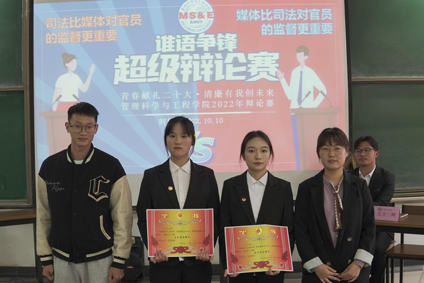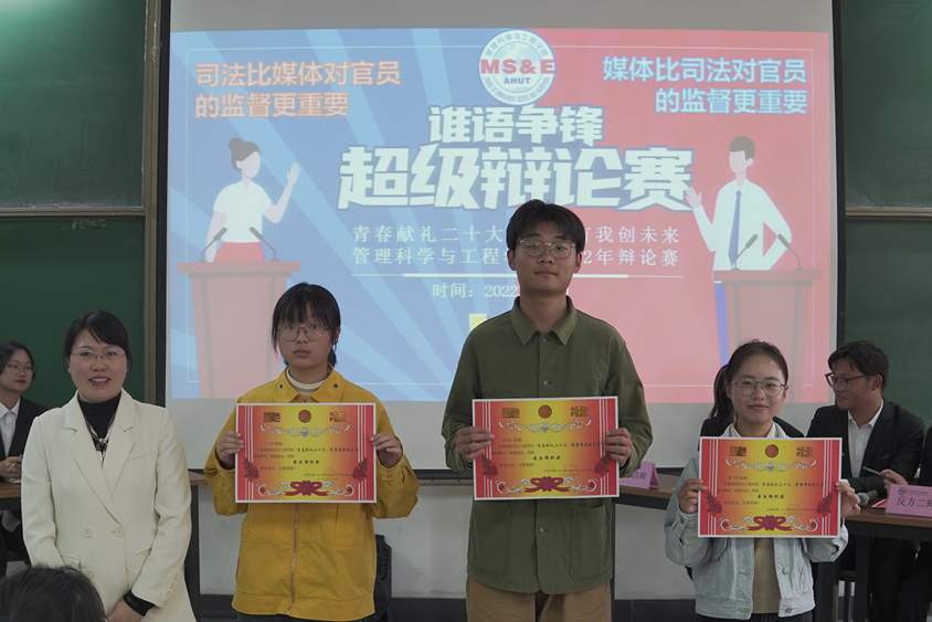 经过初赛、复赛的选拔,共有2支队伍进入决赛。决赛队伍围绕“司法与媒体对于官员的监督谁更重要”进行了对决。辩论中,正反双方辩手紧扣主题,结合当下时政热点、旁征博引,用详实的事例就所立观点展开了激烈交锋,精彩的对决将气氛推上了高潮,赢得场下观众的阵阵掌声。经过立论、驳辩、盘问、自由辩论、总结陈辞、现场提问等环节,最终,反方“善管精工”辩论队获得了冠军,正方“三新”辩论队获得了亚军;价213班许瑾、价221班王梓默获得了最佳辩手;息223班、息221班、工223班获得了最佳组织奖。