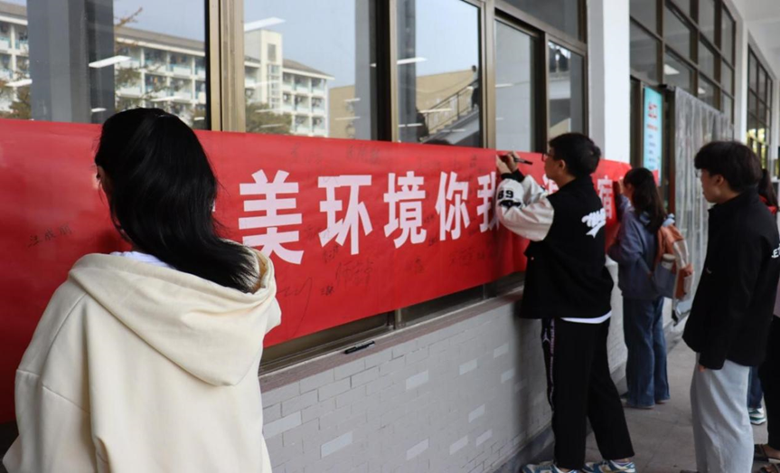 于秀山校区八食堂门口开展了文明宿舍横幅签名活动,全院学生积极参加。