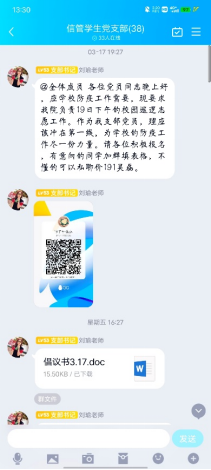 由于疫情特殊时刻,校园进行封闭管理且要求减少聚集,支部线下会议不能正常召开。支部书记刘瑜联合支部其他负责人钱琦、王志红等成员临时组建支部疫情防控宣传小组,在党支部的群里面向各位党员开展相关系列思想宣传工作。