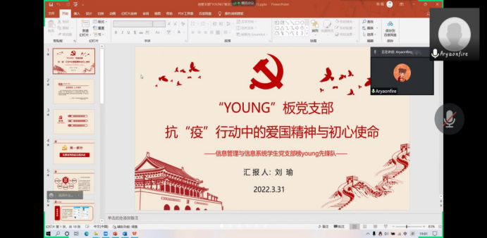 刘瑜先后开展两次线上党支部会议,汇报市区目前的疫情态势,并结合校党委面向全校党员发出的倡议,号召党员在疫情防控中要有所作为,有所担当,以慷慨激昂之辞为正在协同抗击疫情的各位支部党员打上一剂“强心针”。目前,宣传小组成员在群里共计接力发布了“一起向未来”VCR短片、防疫小贴士、抗疫相关新闻等十余项媒体宣传相关材料,还组织支部党员为学院各个学生宿舍分发疫情防控倡议书,时刻鼓励提醒着各位支部党员在关键时刻提高政治站位,扛牢政治责任,紧跟组织引领,筑牢战斗堡垒,坚持冲锋在前,奋勇担当作为。