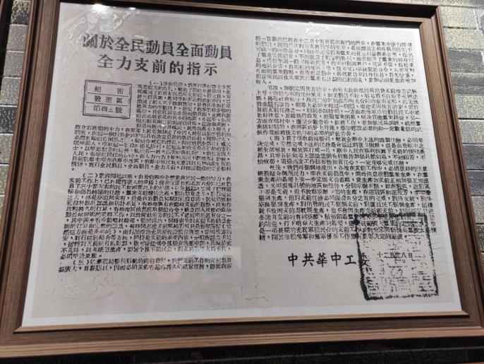 继续向前看到的便是一张工整的战略任务指示书,上面的每一句话都体现了中国共产党为人民服务的决心,每一句话都展现了中国共产党独特的战略眼光与魄力,每一句话都强调了人民的利益,战士的安全,每一句话都掷地有声,每一句话都是大智慧。我们伟大革命战争的胜利离不开中国共产党的卓越领导,离不开中国共产党每一个正确的战略部署,离不开中国共产党每一次做出的正确决定与方向。当代中国青年应以入党为目标,以入党为骄傲,认识到中国共产党诞生于中华民族的危难时候,它一诞生就肩负起了争取民族独立、人民解放和实现国家富强、人民富裕的历史重任,而党也不负众望,带领中国人民从解决温饱问题到实现全面小康。