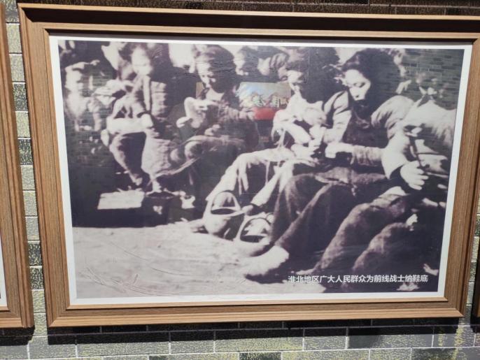 视线继续向前便是淮北地区广大人民群众为前线战士纳鞋底的温暖场景,前线的战士们都是爹娘的孩子,残酷的战争让他们无暇顾及穿着,无暇整理戎装,匆匆前进,勇猛向前。鲁迅先生说:“我们自古以来,就有埋头苦干的人,有拼命硬干的人,有为民请命的人, 有舍身求法的人,他们都是中国的脊梁!”在当时那个战火纷飞的年代,每位战士都是中国的脊梁。质朴的人民群众看着这些人民子弟兵穿着烂的不成样子的鞋,都从家中拿出平时舍不得用的针线,为每一个前线的战士细细地纳鞋底,那不只是鞋底,那一针一线都是父老乡亲对上战场的孩子们的牵挂。战士上前线,群众补后援。同样在当今社会,每个人的命运都是息息相关的,没有一个人是一座孤岛,我们要将事不关己高高挂起的行为彻底摒弃,以青春之我奉献青春之国家,青春之社会,青春之民族。
