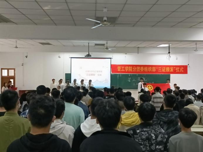 全体团员进行了团旗迎接,合唱了团歌《五月的花海》。万媛媛为同学们开讲了团学第一课。她从团的简介与发展史、团的性质与目标、争做优秀团员三个主要方面进行了主要讲解。紧接着,新生团员代表王晓语同学进行了发言表态,老师们为同学们颁发了团员证、团章,佩戴了团徽。新生领誓人庞德俊同学带领全体新生团员进行了宣誓。最后任静在讲话中激励21级新生努力学习,争做学院优秀共青团员。