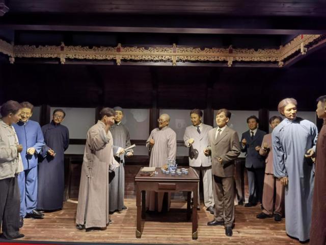 图为嘉兴博物馆中用蜡像布置的中共一大场景。