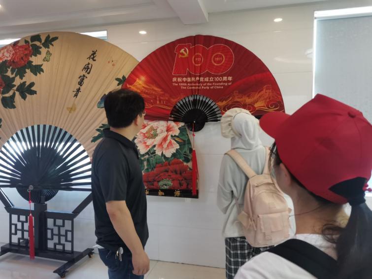 图为实践队员欣赏王明德老先生制作的庆祝建党100周年的纪念折扇。