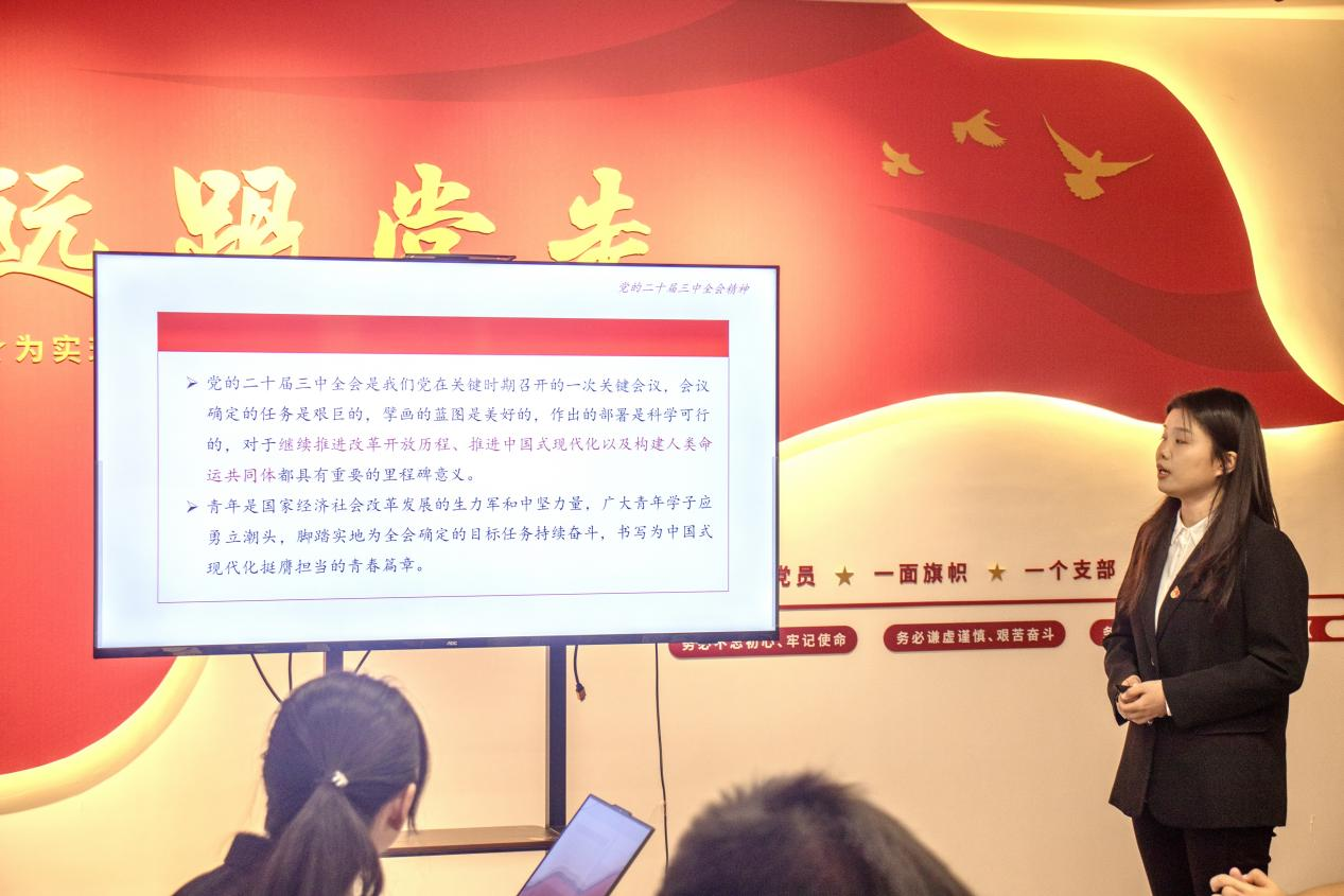 宣讲中,宣讲团成员紧密围绕党的二十届三中全会核心议题,进行了条理清晰、内容丰富的阐述。王丹丹从历史、现实、理论、世界四个维度,详细阐述了党的二十届三中全会对于在新征程上高高举起改革开放伟大旗帜,坚定不移走中国式现代化道路,推动构建人类命运共同体所具有的里程碑意义;杨阳以“数说全会”的形式,通过一个个数字解读全会精神,进一步阐释了全面深化改革的重大意义和总体要求;朱仔仪聚焦《中共中央关于进一步全面深化改革、推进中国式现代化的决定》中关于经济、民主和法治改革的相关内容,对全会精神进行了全面、系统、深入的宣讲。