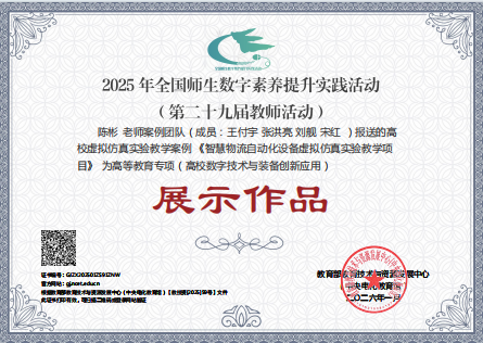 近日,由教育部教育技术与资源发展中心组织开展的“2025年全国师生数字素养提升实践活动”评审结果揭晓。H漫 实验中心申报的虚拟仿真实验教学案例《智慧物流自动化设备虚拟仿真实验教学项目》(负责人:陈彬,成员:王付宇、张洪亮、刘舰、宋红)成功入选,并被列为“高等教育专项(高校数字技术与装备创新应用)”展示作品。