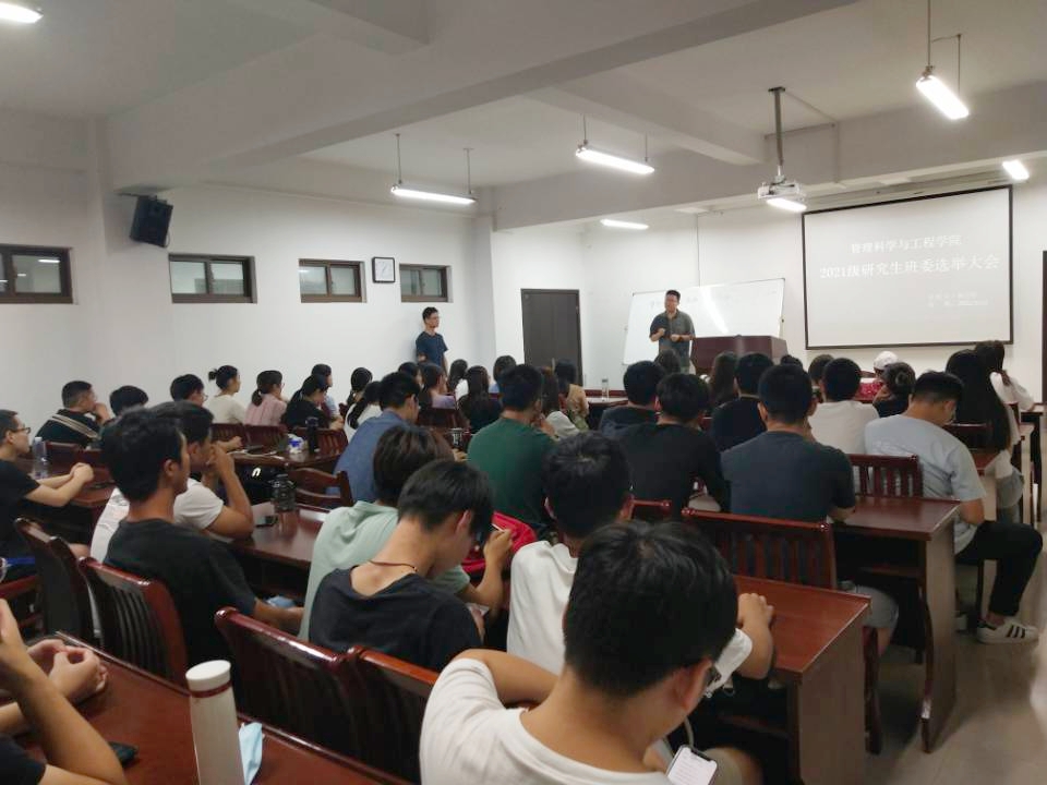 在汇文楼A308召开2021级研究生班委选举大会,全体2021级研究生到会,20级班级负责人操礼春主持会议。