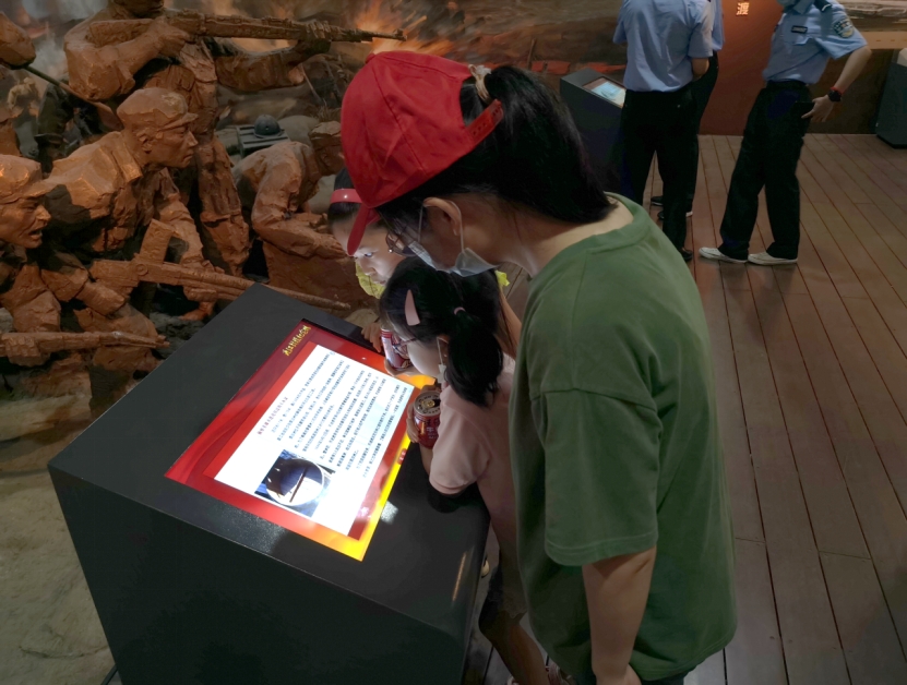 图为实践队员和小朋友们一起在渡江场景还原雕塑前通过观看视频了解中国人民解放军冒着国民党军军舰和江防炮火拦截下强渡抢滩的具体情形,感受渡江战役胜利的来之不易。