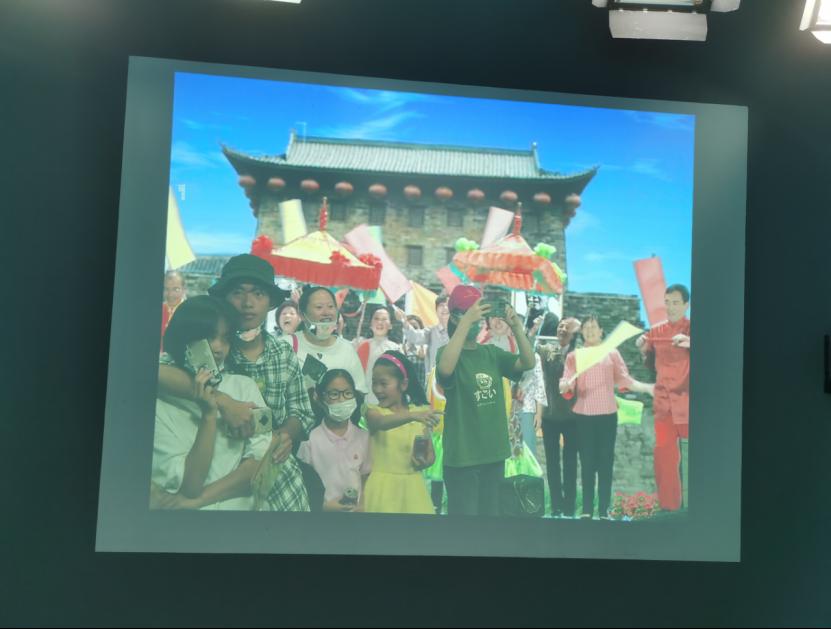 图为实践队员与投影屏幕中为庆祝新中国成立而欢聚一堂的五十六个民族跨越时空的合影。