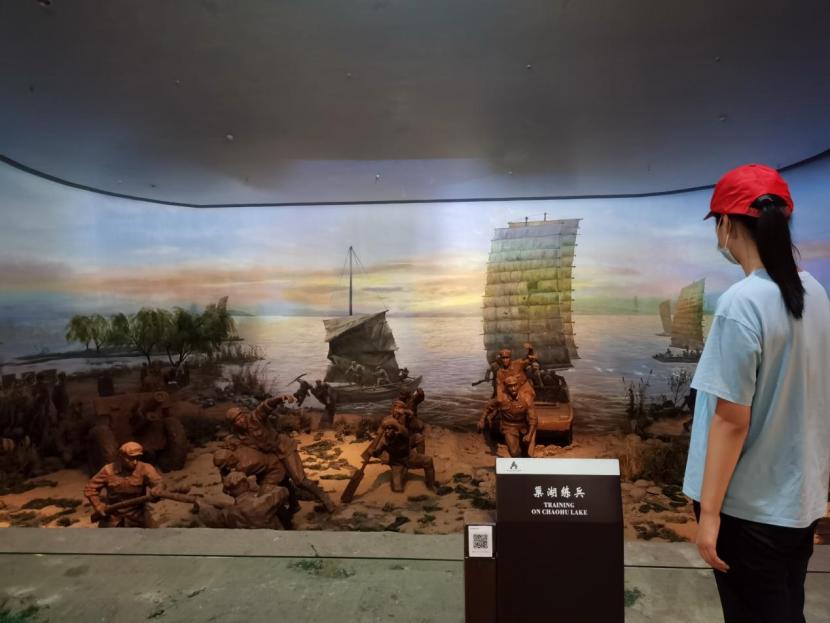 图为团队成员在观察由谭震林指挥的第七第九兵团在巢湖练兵场景还原雕塑,战士们在进行泅渡、船只操控以及各兵器在水上瞄准射击等多项练习。