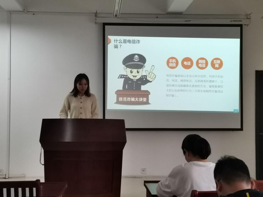 随后,刘倩文针对网络电信诈骗预防问题,从基本概念、形式、识别方式以及补救措施等四个方面向同学们生动形象阐述了电信诈骗给校园与师生造成的恶劣影响和危害,号召同学们增强防范意识,警惕诈骗信息。