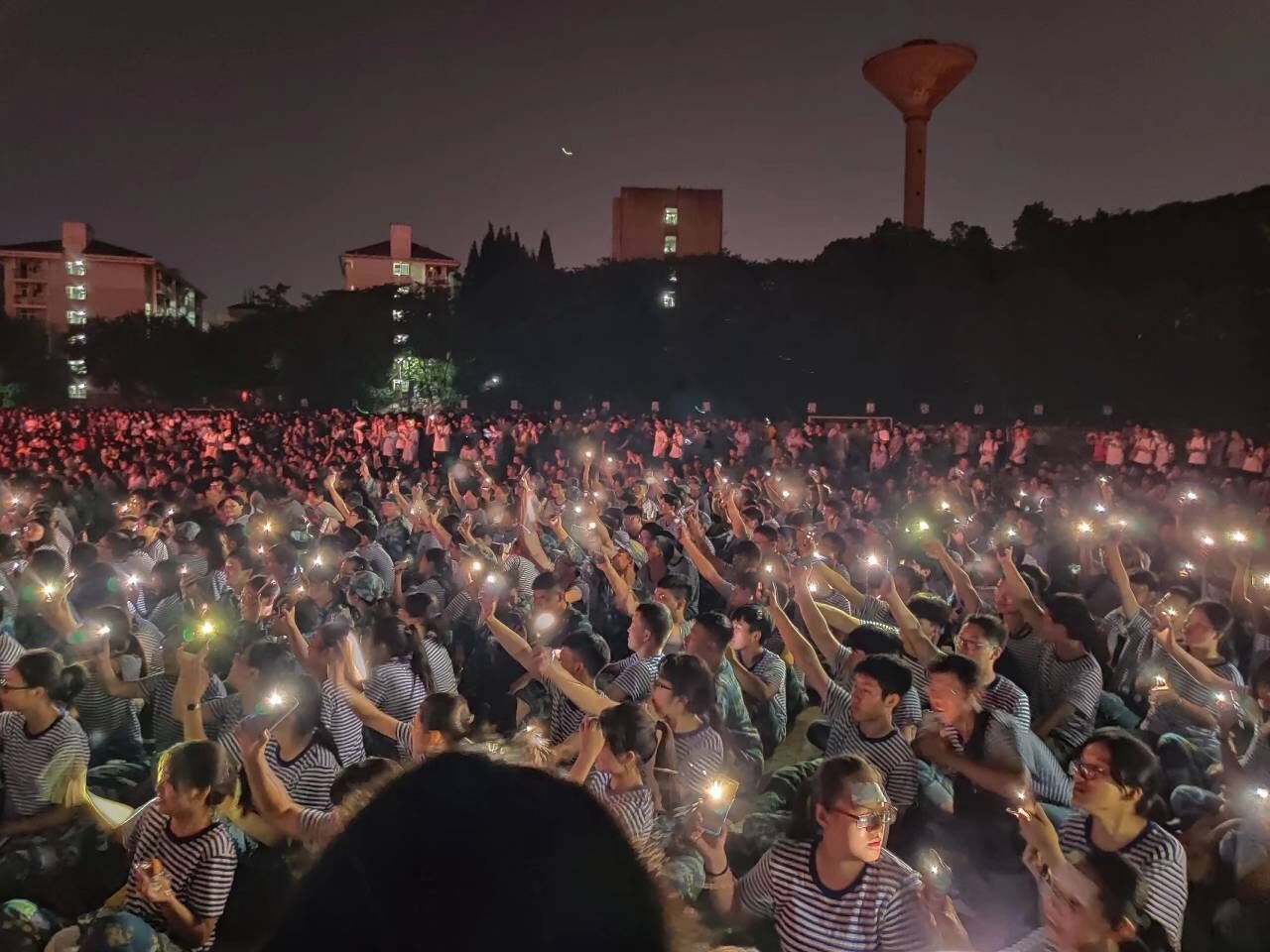夜幕降临,田径场上灯光绚烂,迎新晚会盛大精彩。一群穿着迷彩服的学生正坐在操场上,一只手拿着带有H漫
