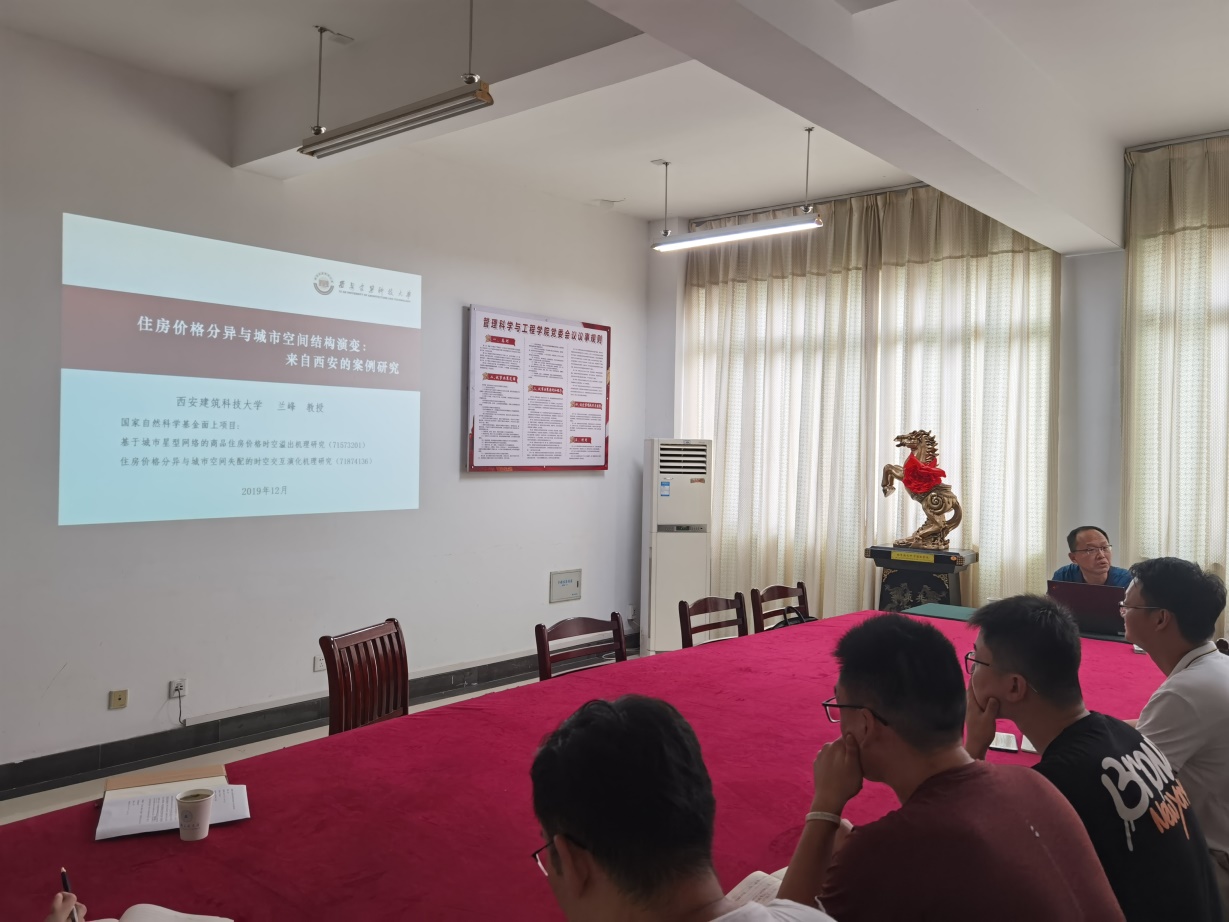7月19日,西安建筑科技大学管理学院副院长(主持工作)兰峰教授应邀做题为“住房价格分异与城市空间结构演变--来自西安的案例研究”的学术报告。报告由学院副院长王付宇主持,学院部分教师及在校研究生聆听了报告。